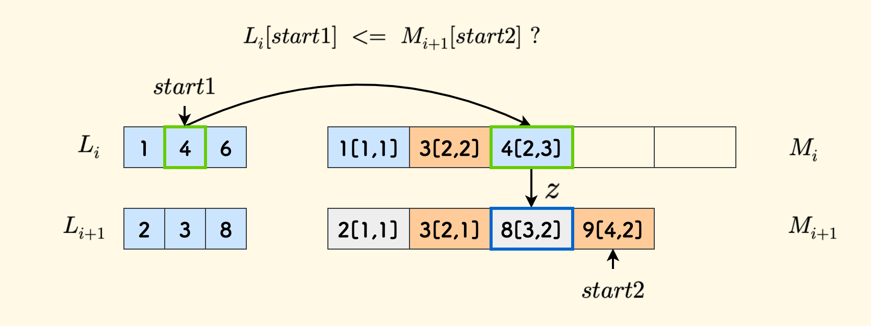 当 $L_i$ 中的元素更小时,它要记录的 $z$ 字段不能简单的采用 $start2$ 的值,因为 $start2$ 是按步长 $2$ 走的,它可能跳过 $L_i[start1]$ 的真正的后继。 比如下图中就是一个例子。这时候要检查一下 $start2-1$ 的情况,从 $start2-1$ 和 $start2$ 中挑选一个作为 $z$ 的取值。