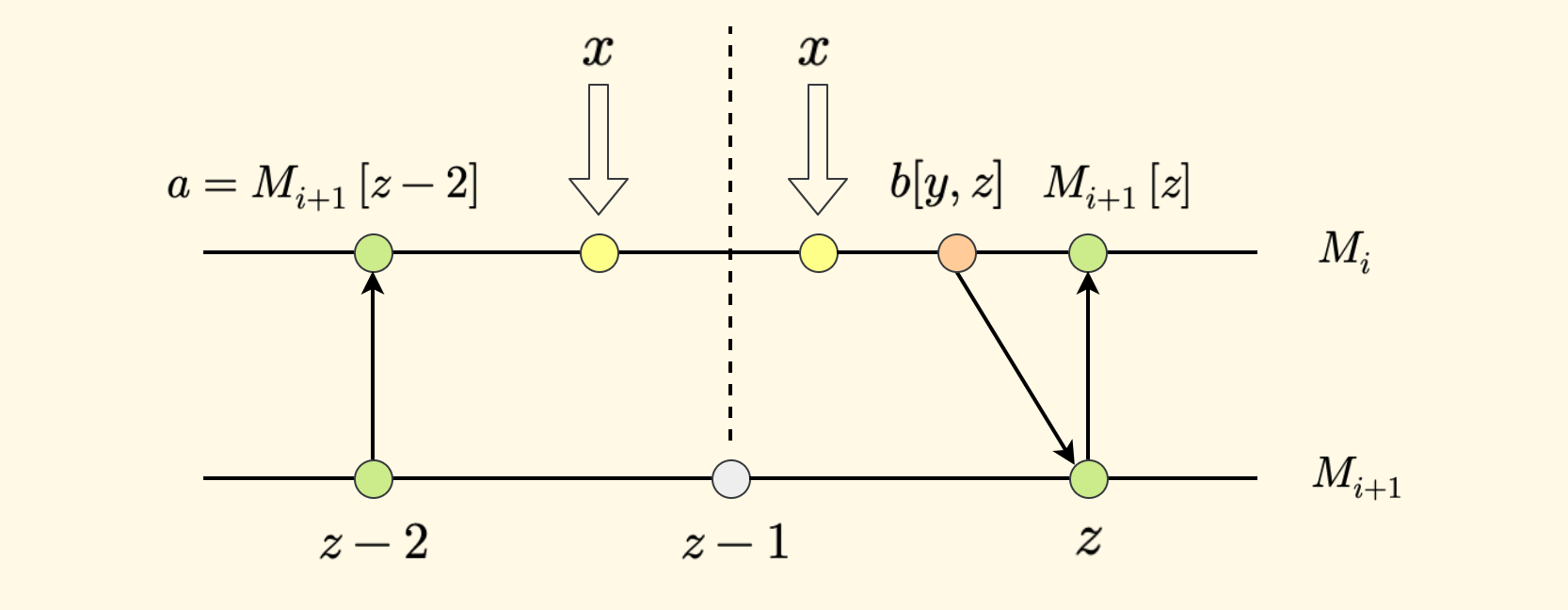 - $z$ 表示数值 $x$ 在 $M_{i+1}$ 中的后继位置。