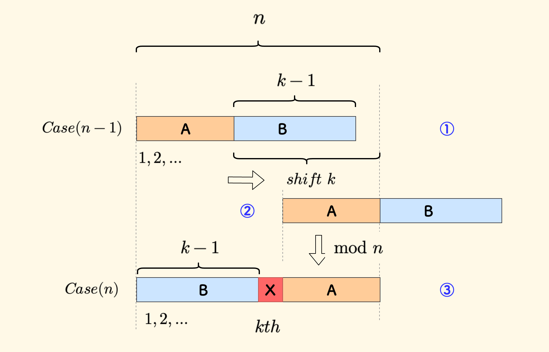 另外,此时 B 尾部和 A 之间会恰好有一个空位。 ③ 号状态下开始计数,这个空缺恰好是第 $k$ 个元素(图中红色的 X),也就是 $Case(n)$ 情况下要删除的数字。