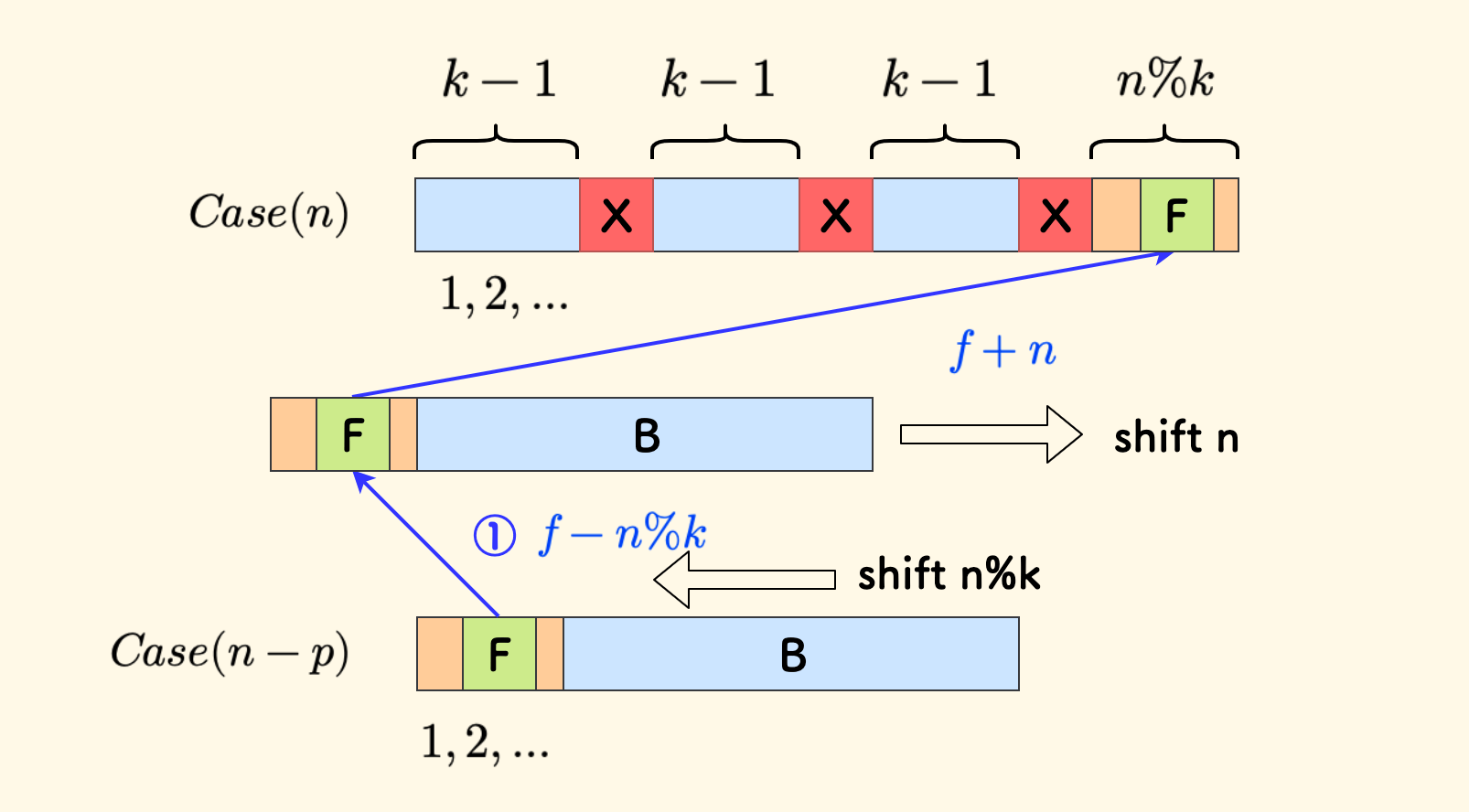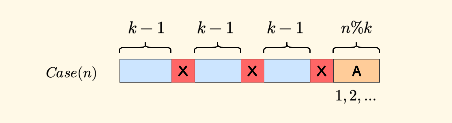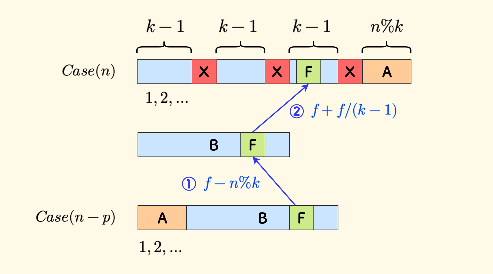\[f \leftarrow f + f/(k-1)\]F左边被删除的数字补回来,因为每间隔 $k-1$ 个B中的数字就删除一个红色的X,那么F左侧一共分摊 $f/(k-1)$ 个: