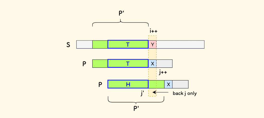 现在的结论是,失配时,可以直接把 j 回溯到已经匹配的 P' 的最大头尾重叠部分后面,继续匹配过程,而不必回溯 i。