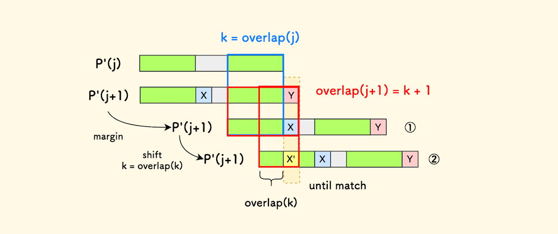 此时,如果字符 Y 和 X' 相等,那么 overlap(j+1) 就是以 X' 结尾的字符串的长度。