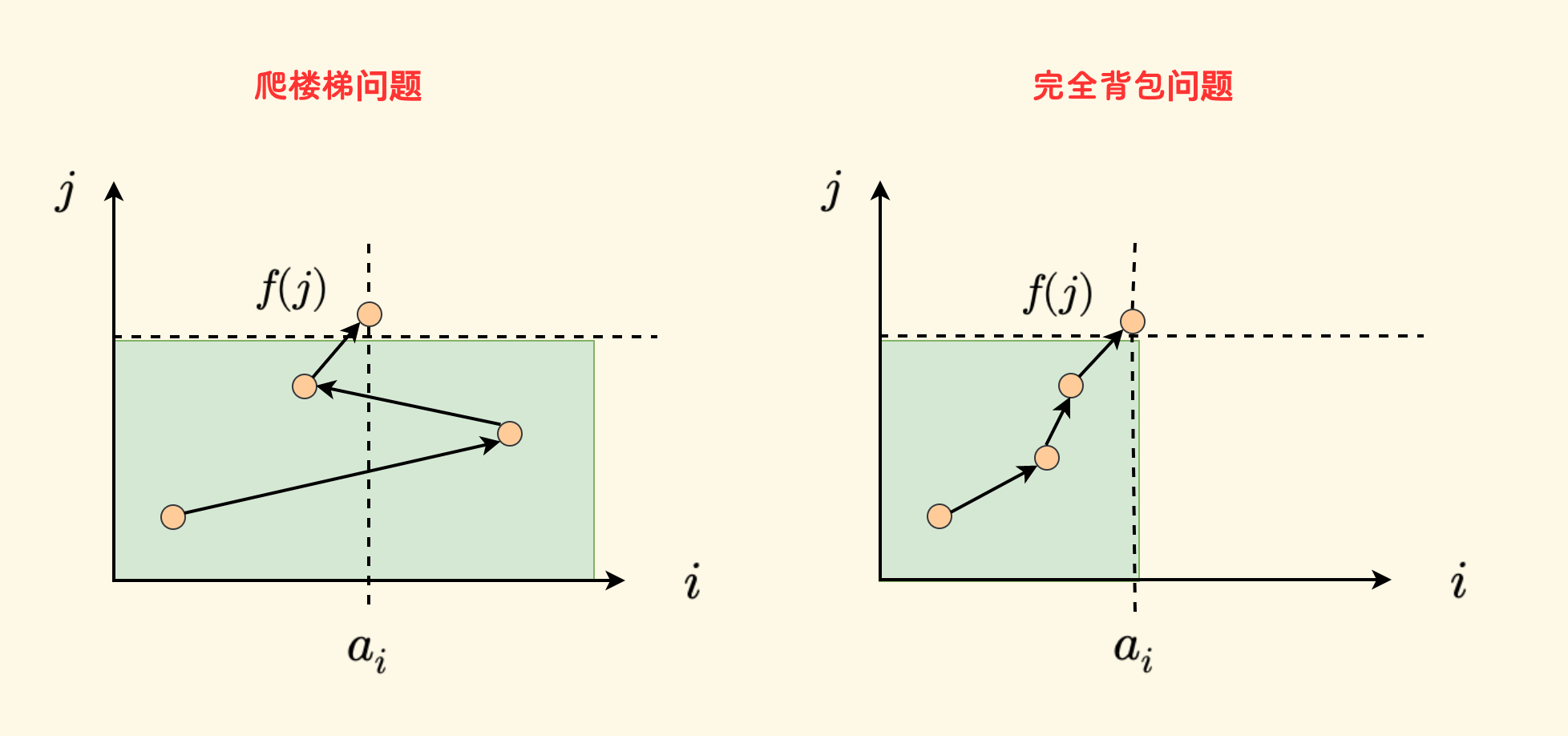 - 这个爬楼梯问题,是以目标 $j$ 来划分阶段,使用每个 $a_i$ 来转移。