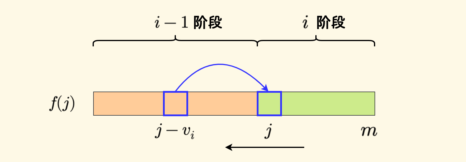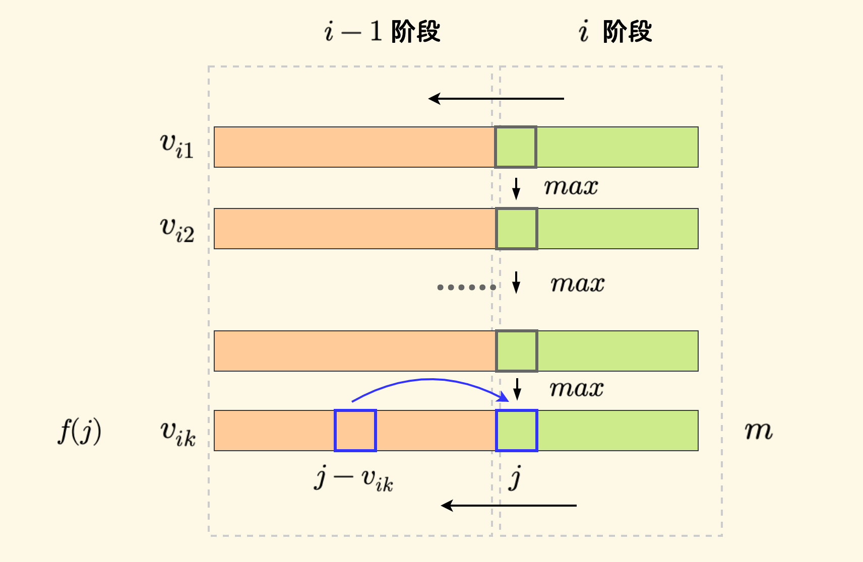 for (int j = 0; j <= m; j++) ans = max(ans, f[j]);类似于 01 背包的分析,从左向右正序遍历时,$f$ 数组上的 dp 过程就是从 $i-1$ 到 $i$ 阶段进行转移。