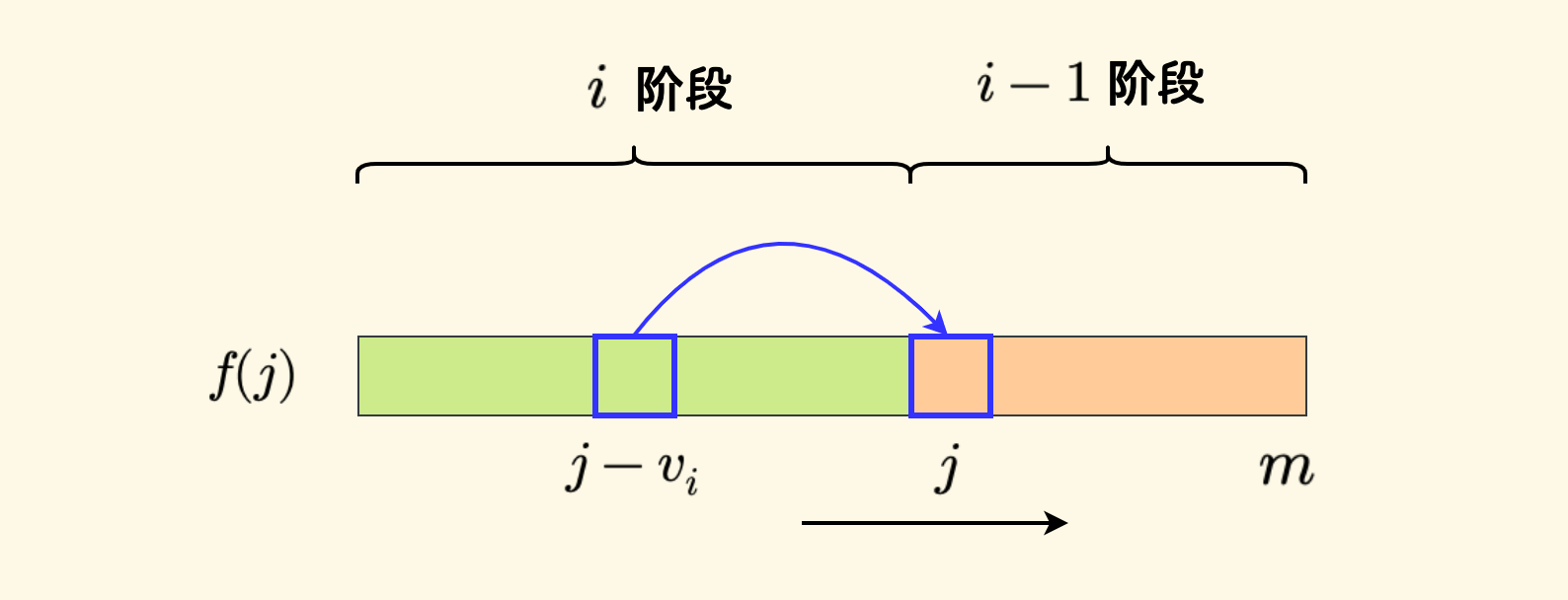由于计算 $f(j)$ 时,左边的 $f(j-v_i)$ 仍处于 $i-1$ 阶段,所以对每个 $f(j)$ 来说,第 $i$ 个物品仅考虑了一次。