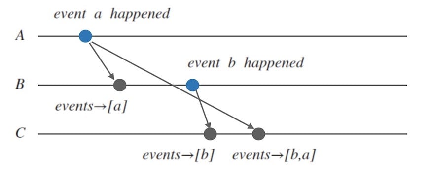 - 但是由于无法确定的网络延迟原因,导致进程A发出的消息到达C晚于进程B发出的消息到达C,这样 进程C的视角上,最终看到的事件顺序是 $b, a$,但是这与事实是相悖的。