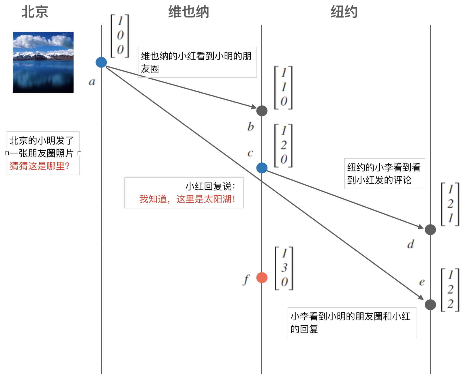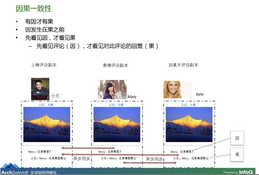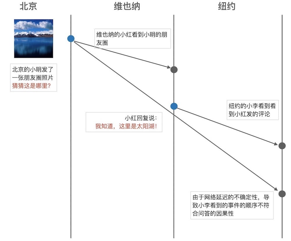 - 但是由于无法确定的网络延迟的原因,导致纽约的数据中心先收到小红的回复,而后收到了原始的提问消息。 这样,导致最终小李看到的问答顺序是不符合问答的因果一致性的。