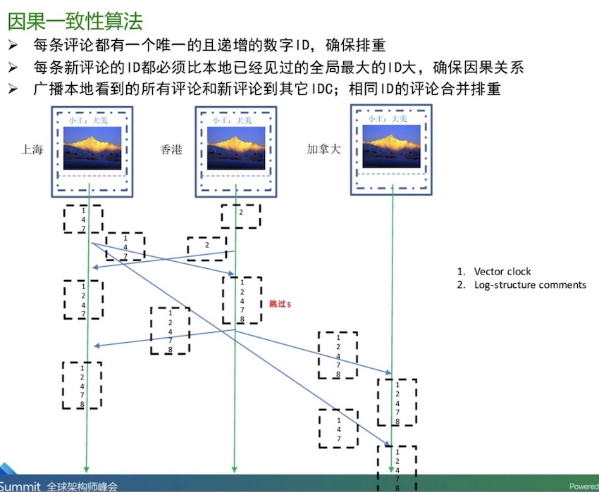 下面是微信朋友圈架构设计的两个关于因果一致性算法设计的PPT截图(来自《微信朋友圈技术之道》,链接已经损坏):