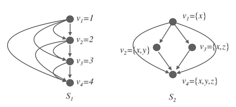 而$S_{2}$上的关系,描述的是集合之间的包含关系,是一种偏序关系,其中 $v_{2}$ 和 $v_{3}$ 是不可比较的。