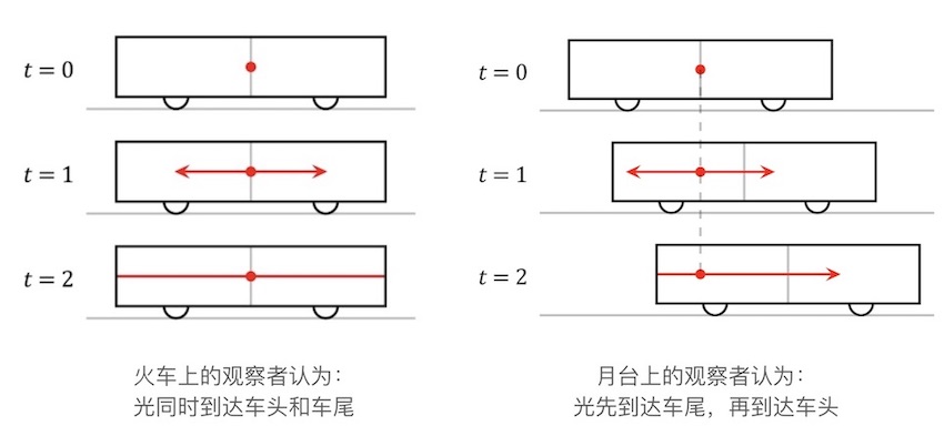 对于火车上的观察者$A$而言,由于火车头和火车尾距离光源的距离是相同的, 因此观察到了光同时到达了车头和车尾。