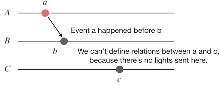 爱因斯坦的狭义相对论告诉我们,时空中不存在绝对的全序事件顺序, 不同的观察者可能对哪个事件是先发生的无法达成一致。 但是有偏序关系存在,当事件e2是由事件e1引起的时候,e1和e2之间才有先后关系。