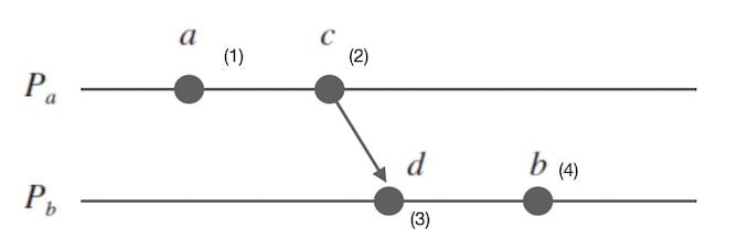 - 如果事件 $a$ 是「发送了一个消息」,而事件 $b$ 是接收了这个消息,则 $a \rightarrow b$。