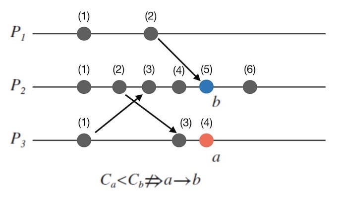 我们无法推导出 $C_{ a } < C_{ b } \Rightarrow a \rightarrow b$ 的原因,在于 $a$ 可能和 $b$ 并发。