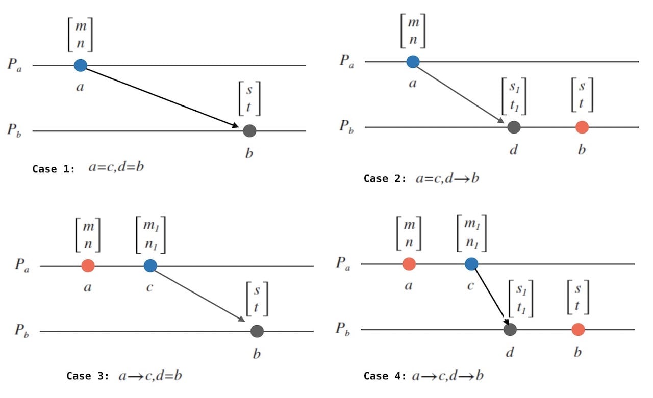 图14 - 中间必然存在$P_a$向$P_b$发送了消息 实际上,可以分为以下几种情况: