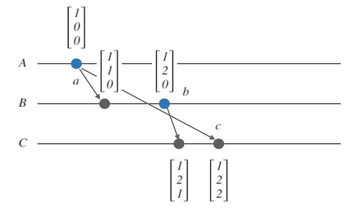我们可以从下面的图16中看出, $VC_{a} < VC_{b} < VC_{c}$,那么可以确定 $a \rightarrow b \rightarrow c$。 也就是我们找到了一种方法来描述这种情况下的事件顺序。 进程$C$的视角下观察 $a$ 和 $b$ 的顺序的问题也有了明确的答案。