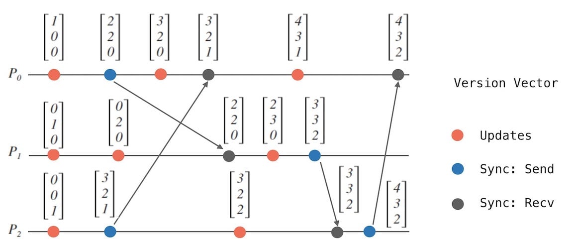 - 接收到消息的时候,也就是蓝色事件,需要对齐对方的向量,并应用第一条规则,即自己的向量内相应计数器自增。