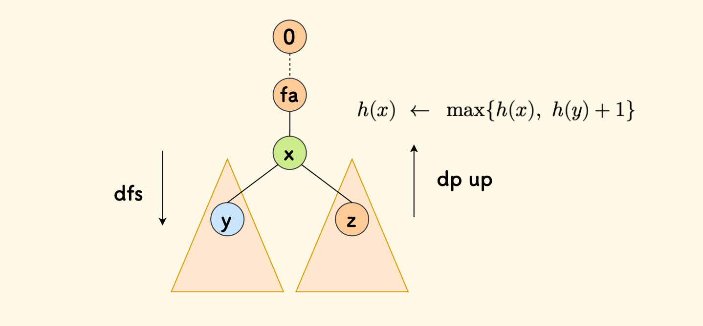 首先,以 $0$ 号节点为根,计算出每个节点 $x$ 为根的子树的高度 $h(x)$。