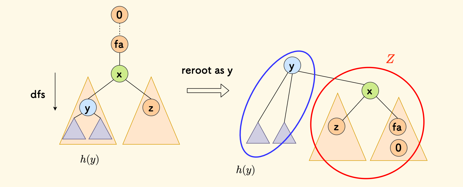 已经知道下图中蓝色圈的高度 $h(y)$,但是要考虑下红色圈 $Z$ 的情况,它由 $x$ 以及原来的上游部分、$y$ 的兄弟子树 $z$ (可能有多个)组成。