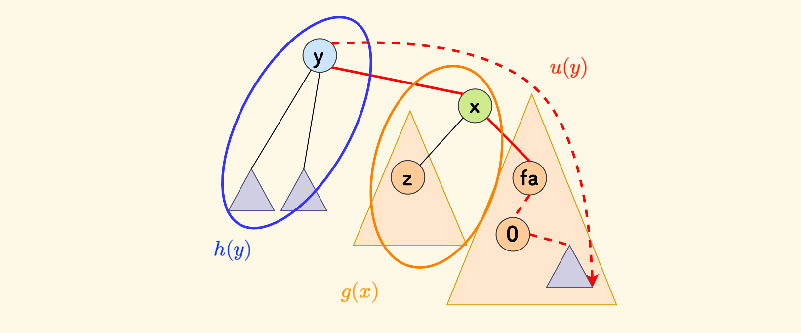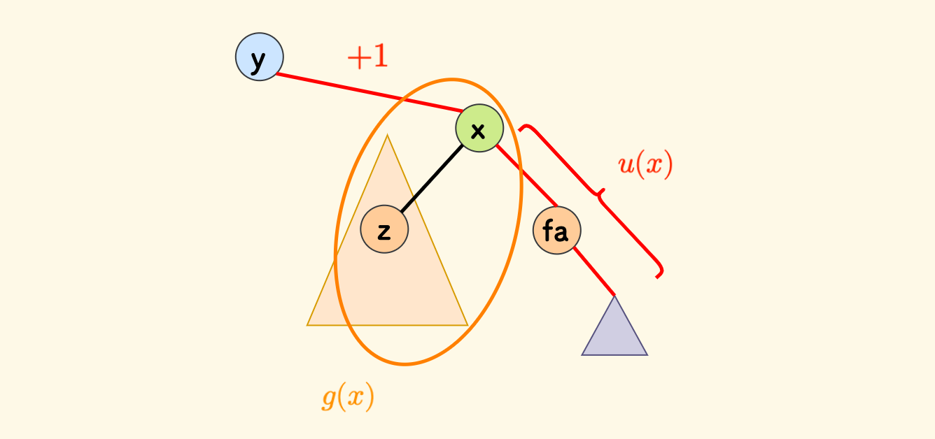 容易知道,因为要么走兄弟 $z$ 、要么走祖先 $fa$,所以 $u(y)$ 一定是 $\max{\{h(z)+1,u(x)\}}+1$。