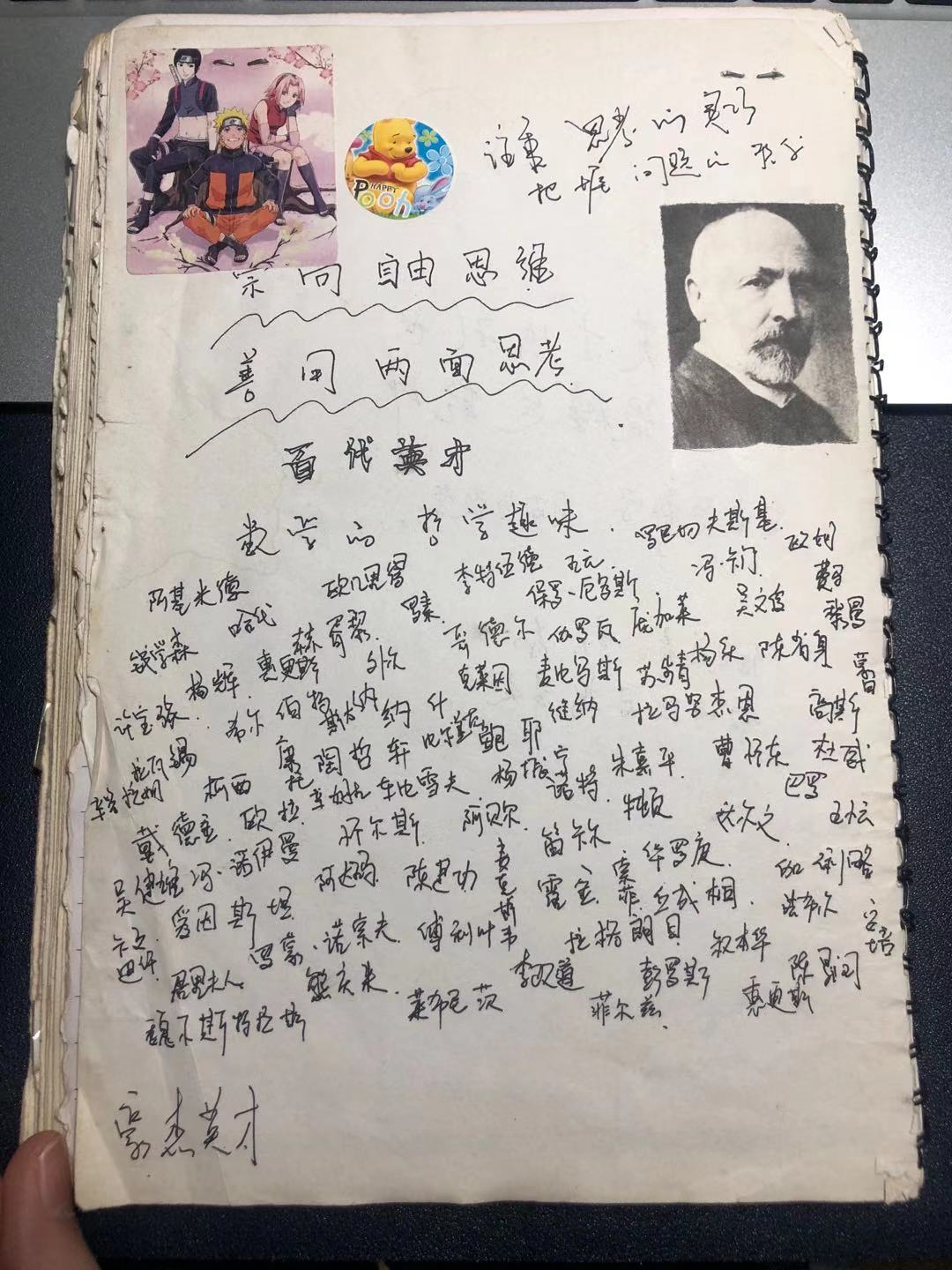 这是同一个笔记本上,最尾页的一句话,这句话到现在还有很深的印象。当时阅读康托的数学史,了解到他如何做出一一映射和对角线证明、如何富有革命精神地坚守真理、甚至患上精神疾病, 其中还有吸引人的悖论、自指,许多命题经常让我在自习课上面向窗外幽黑寂静的夜,“云里雾里、想入非非”。而康托所带给我的思维、认知上的巨大冲击,给我以启示,就是思维的自由性是非常珍贵的, 不要禁锢自己的思维。