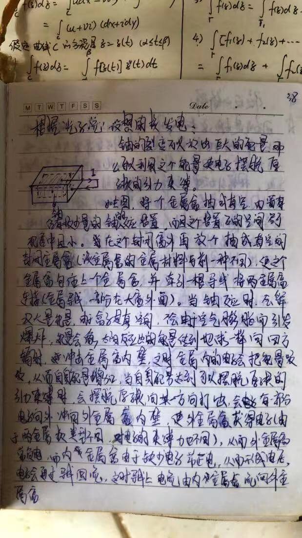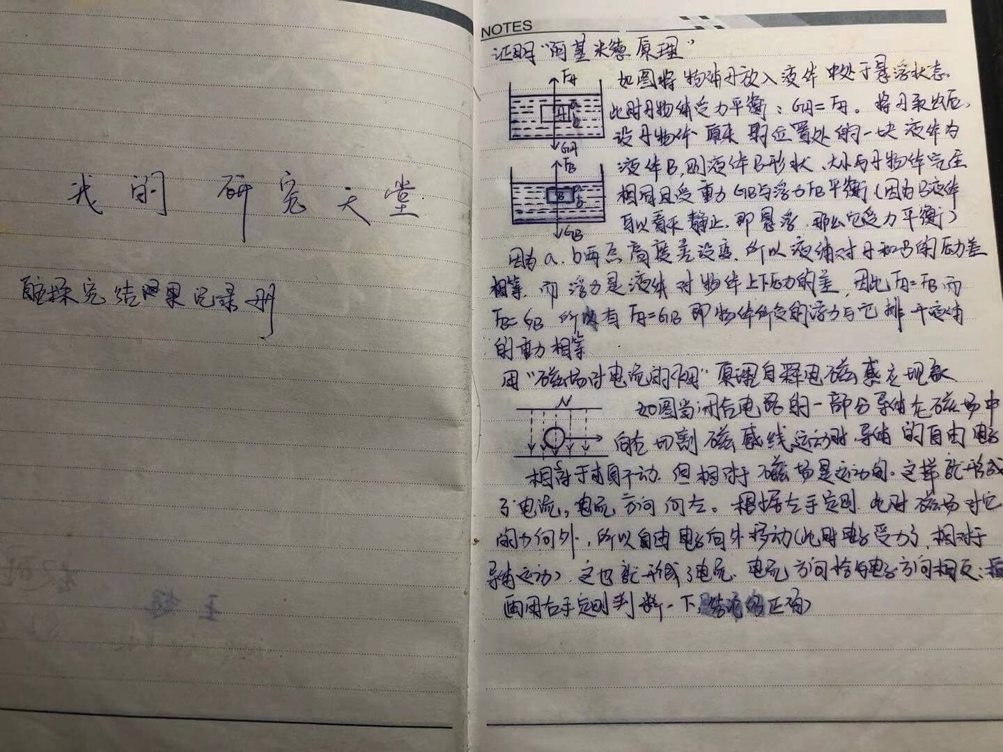 初中时候,我有两个业余爱好:写小说和研究数理。记得当时写了一本神话小说叫做《莲花仙子》,在各个宿舍传阅,如今已经找不到那个本子了。 不过,研究数学和物理的本子《我的研究天堂》还在。里面记录了很多天真的、对物理定理的解释、证明,甚至一些发明。