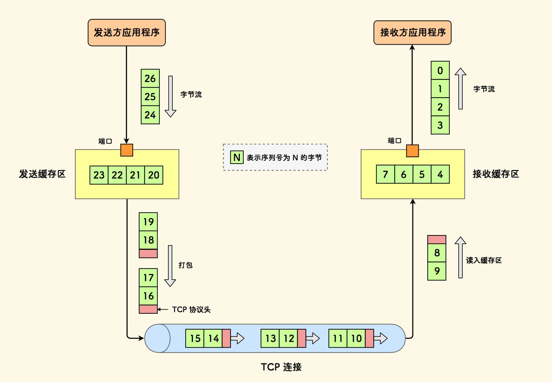 - 和上层应用进程的交互方式是 面向字节流的。