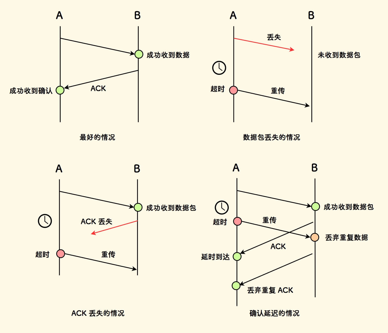 此外,无论往返中哪个包丢失或延迟, 发送方认为对方没有收到,就会重传 。