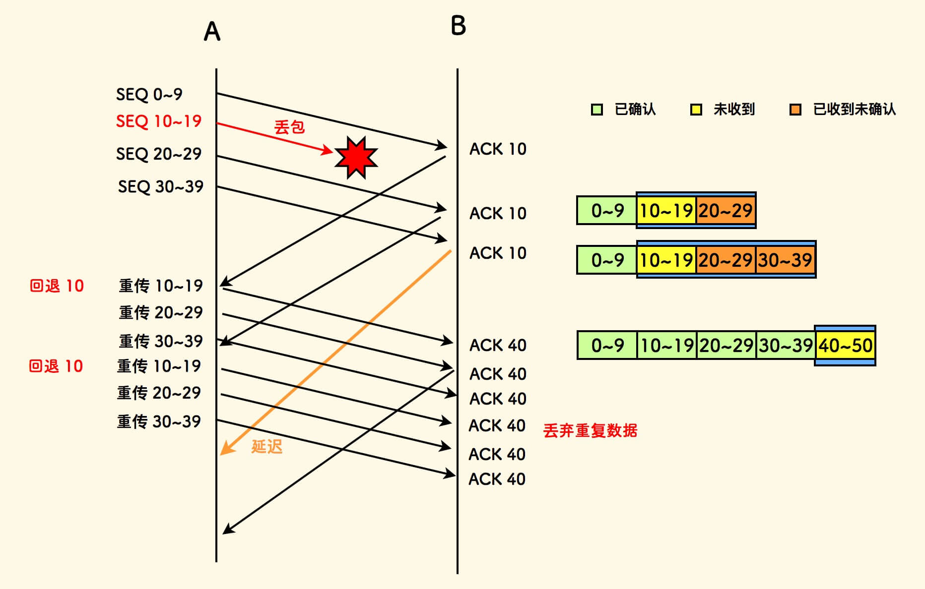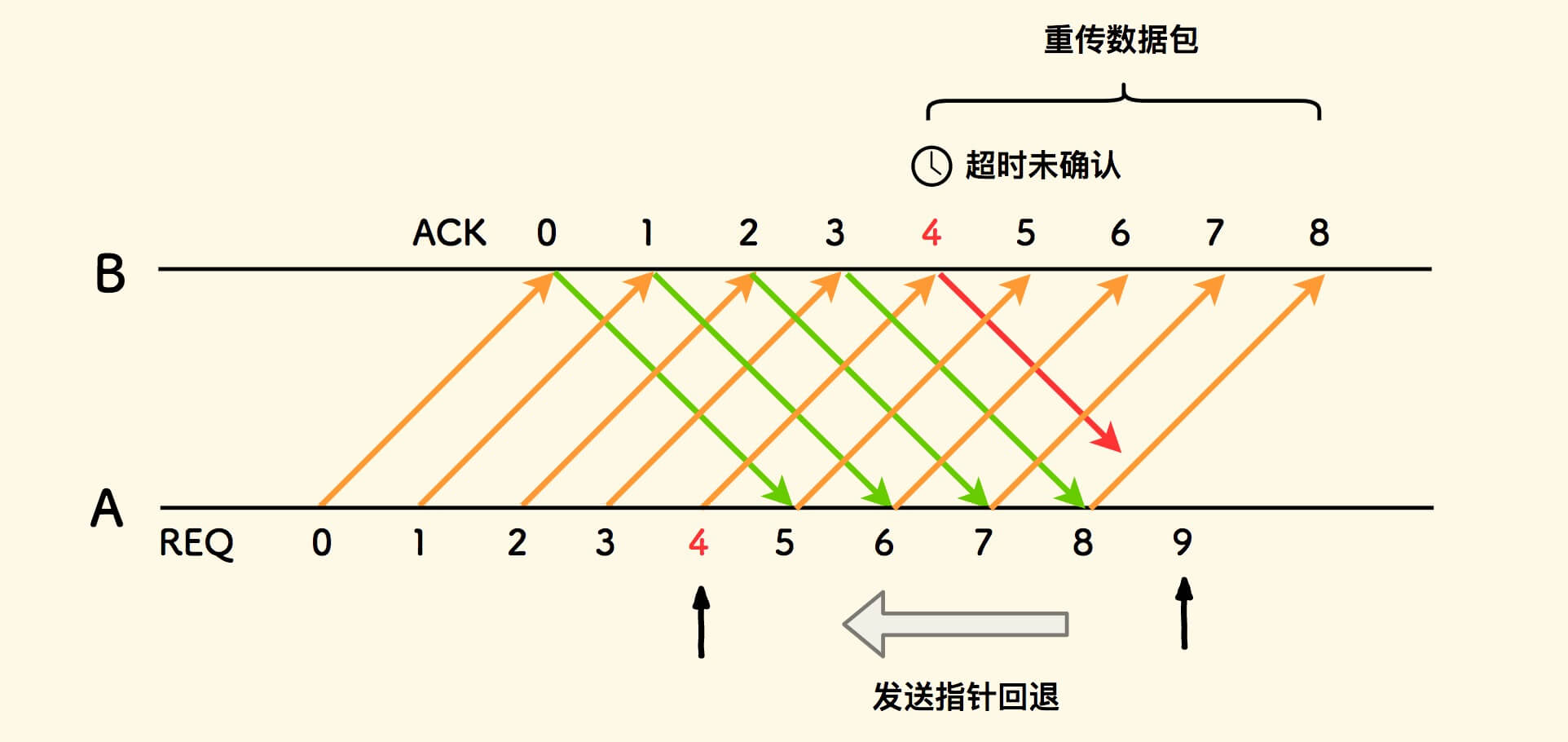 发送指针回退到未拿到确认的数据包处,以实现重传。