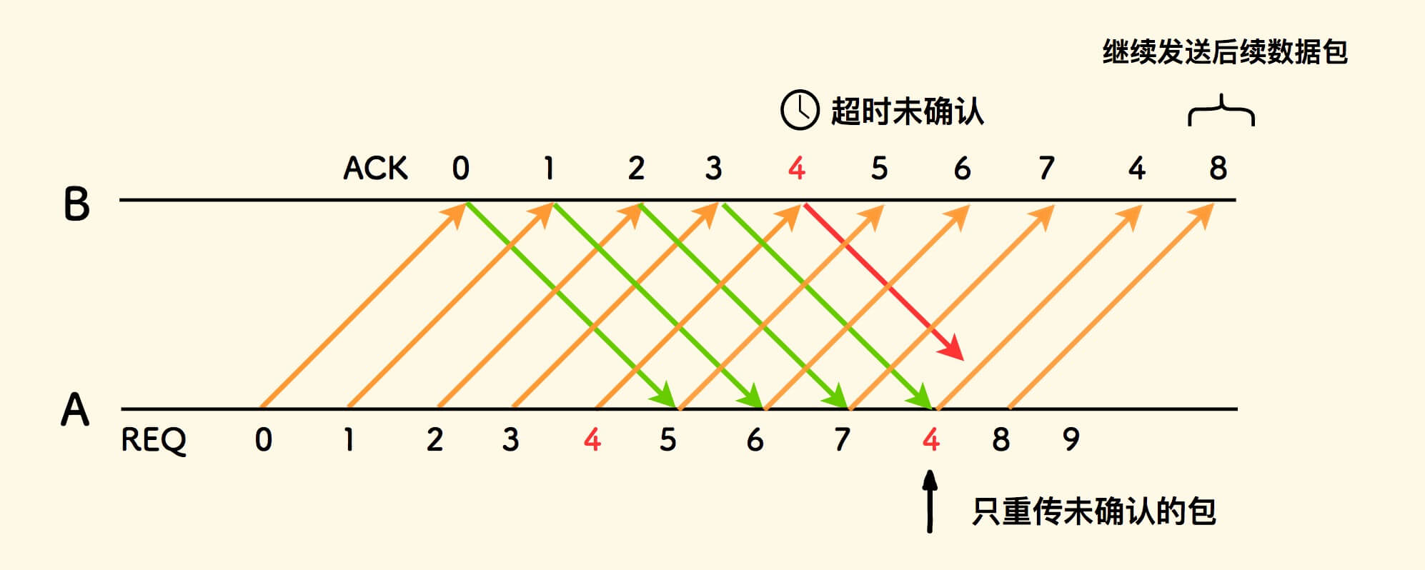 图 2.4 - 回退 N 重传的方式 可以看到,此方法下, 会重传后面所有的数据包。