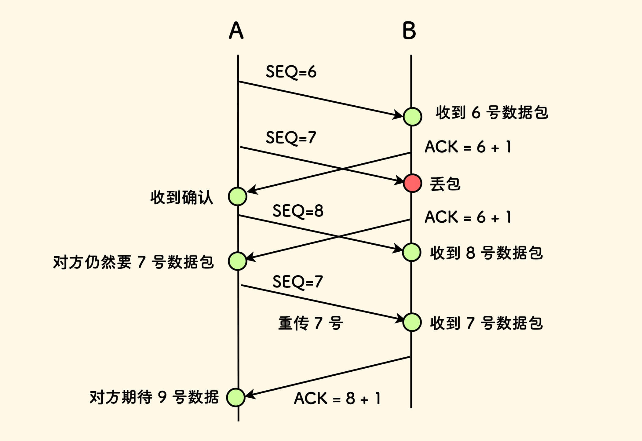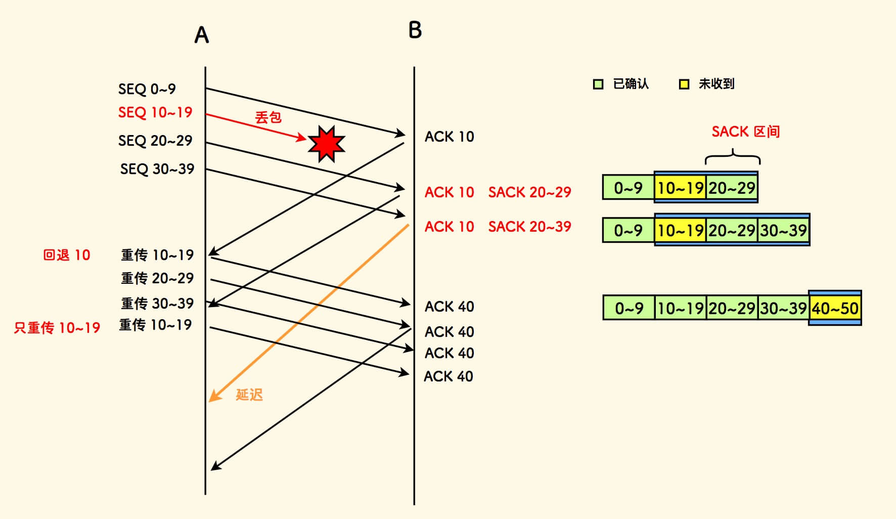 - 如果丢包发生,发送方需要重传。