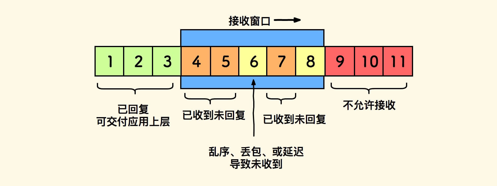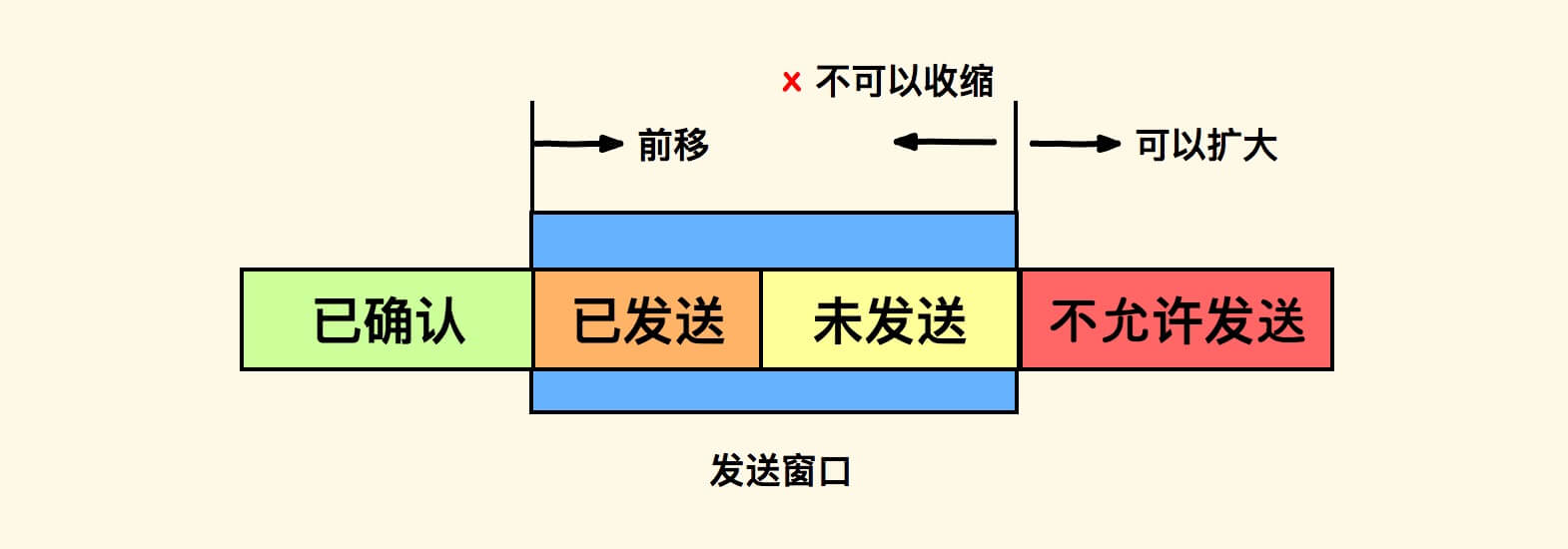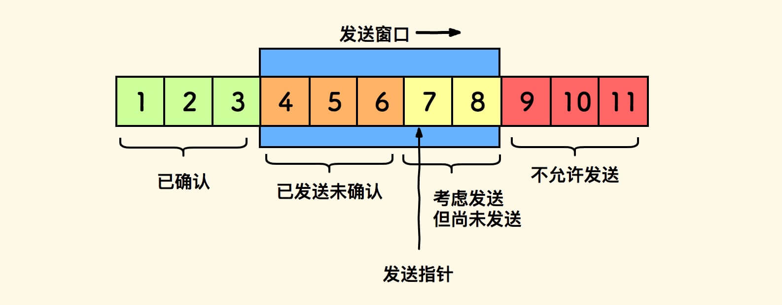 发送窗口的示意图如下,当收到对方的累计确认后,则向右滑动。