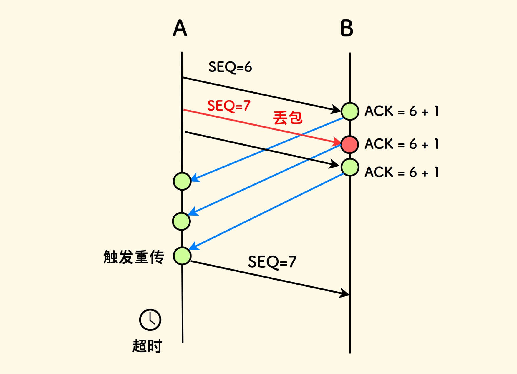 一种触发重传的方式是,超时重传 (也有其他触发方法,见后续 TCP 重传机制 )。