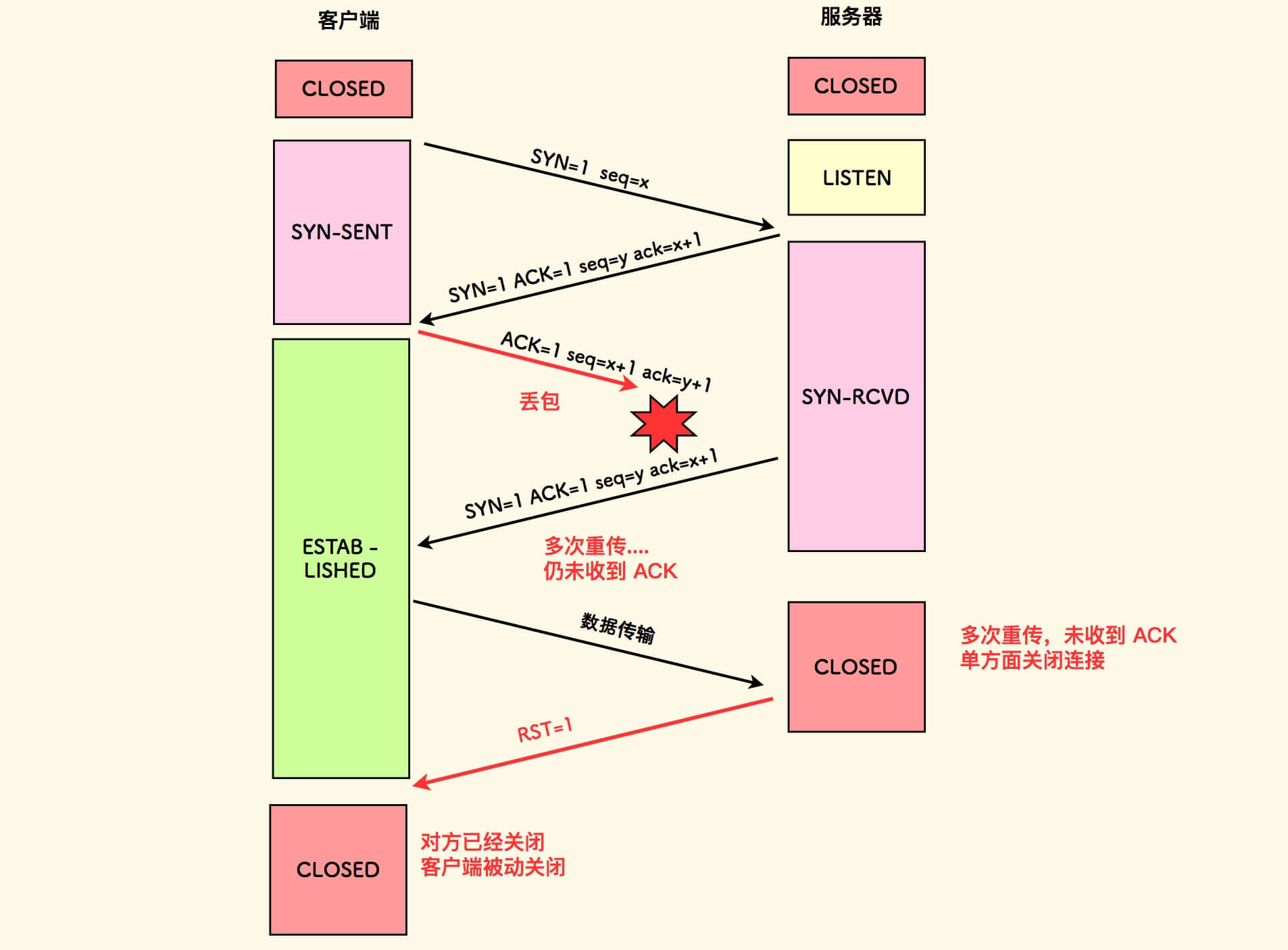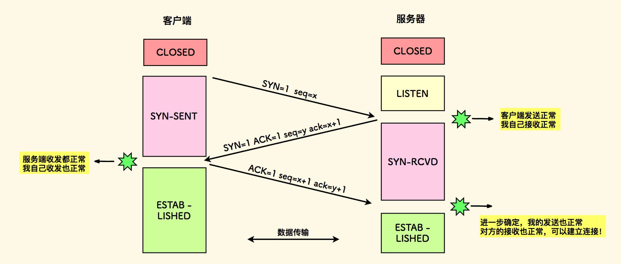 ESTABLISHED状态。 - 服务端则是在三次握手之后才进入