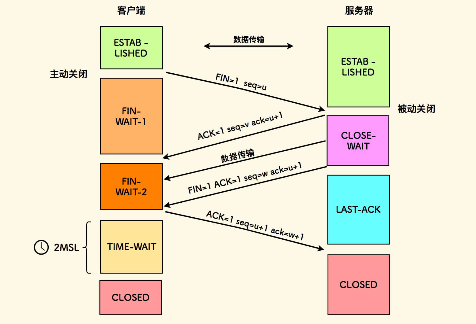 假设客户端主动关闭,下面是 TCP 协议四次挥手释放连接的过程示意图。