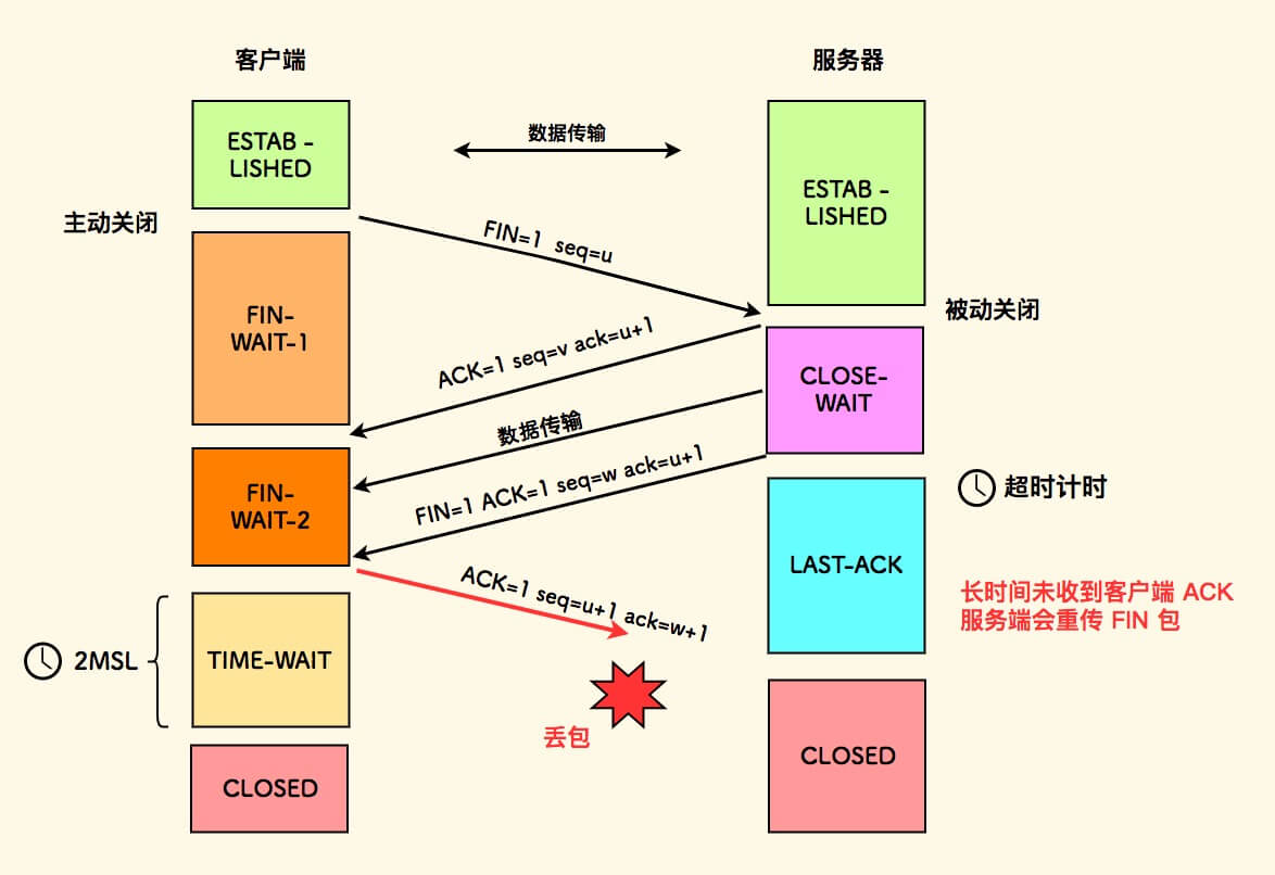 如果任何一个确认包发生丢包或延迟,主动设置 FIN 的一方会触发重传。