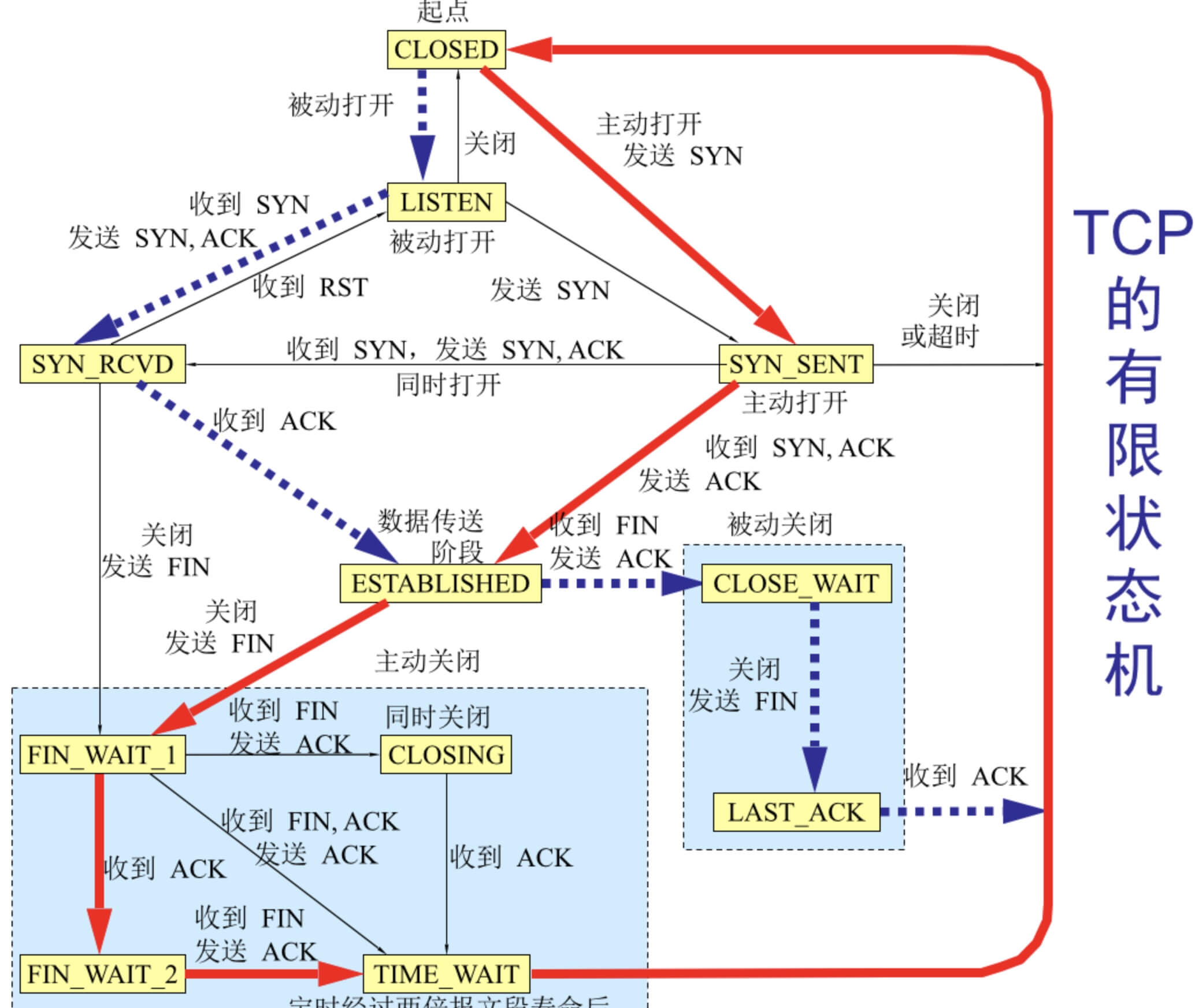 综合连接建立和连接关闭的过程,整个 TCP 连接的状态机图示如下。