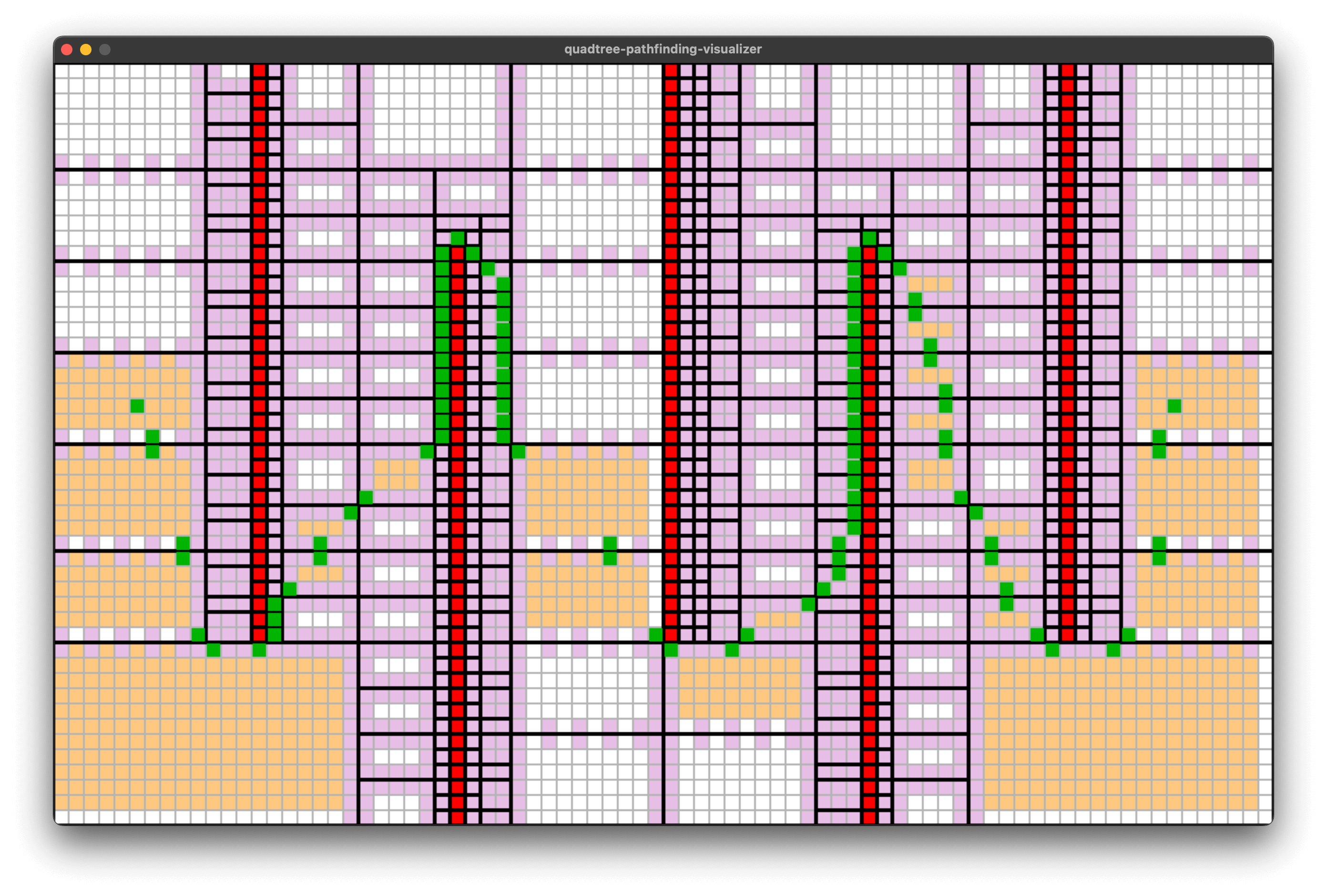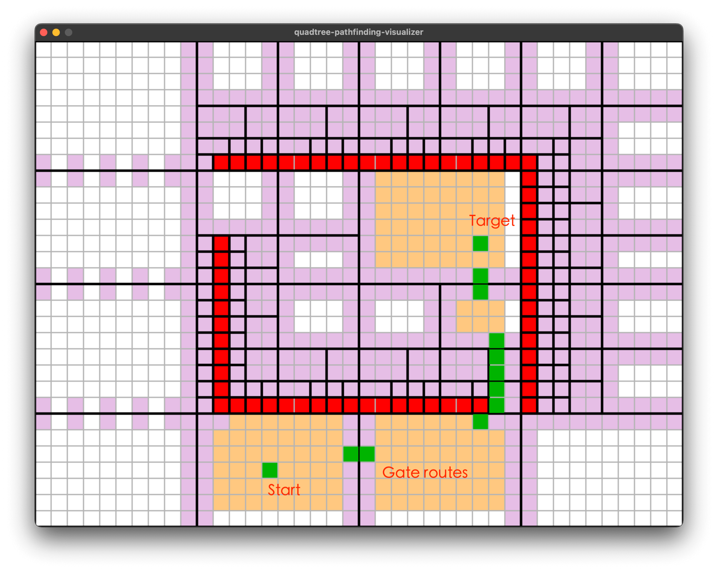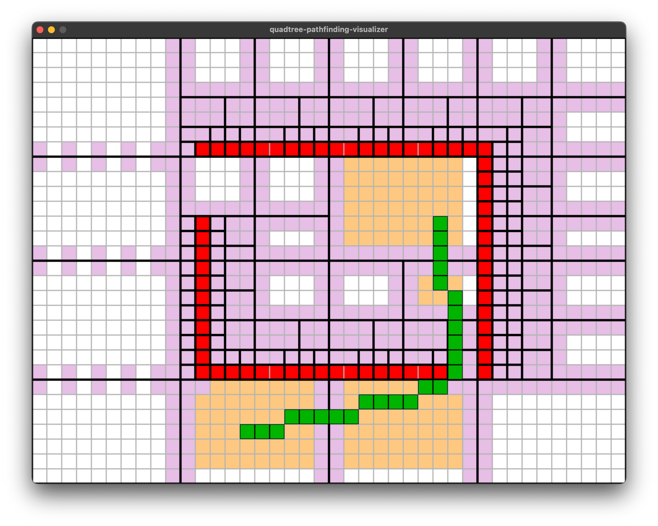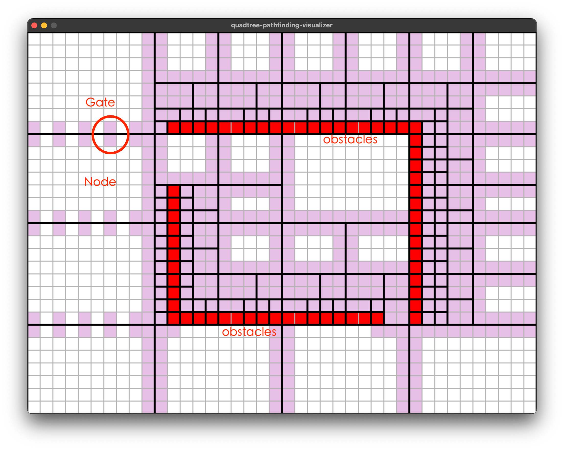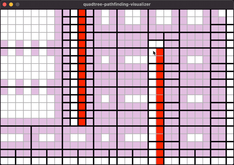 - 整个网格被四叉树不断分割,红色的是障碍物。每个四叉树叶子节点中要么全是障碍物、要么全不是障碍物。