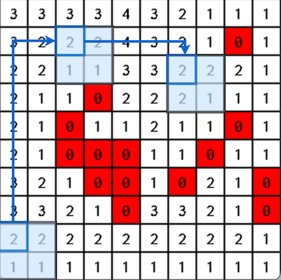 比如说下图中,参与寻路的智能体大小是 2x2 的,始终以智能体的左上角单元格作为其位置,所谓 “true-clearance” 就是说一个单元格距离右下方的最近的障碍物的距离。 下图中的红色的是障碍物,方格中的数字就是要计算的 “true-clearance” 的值。