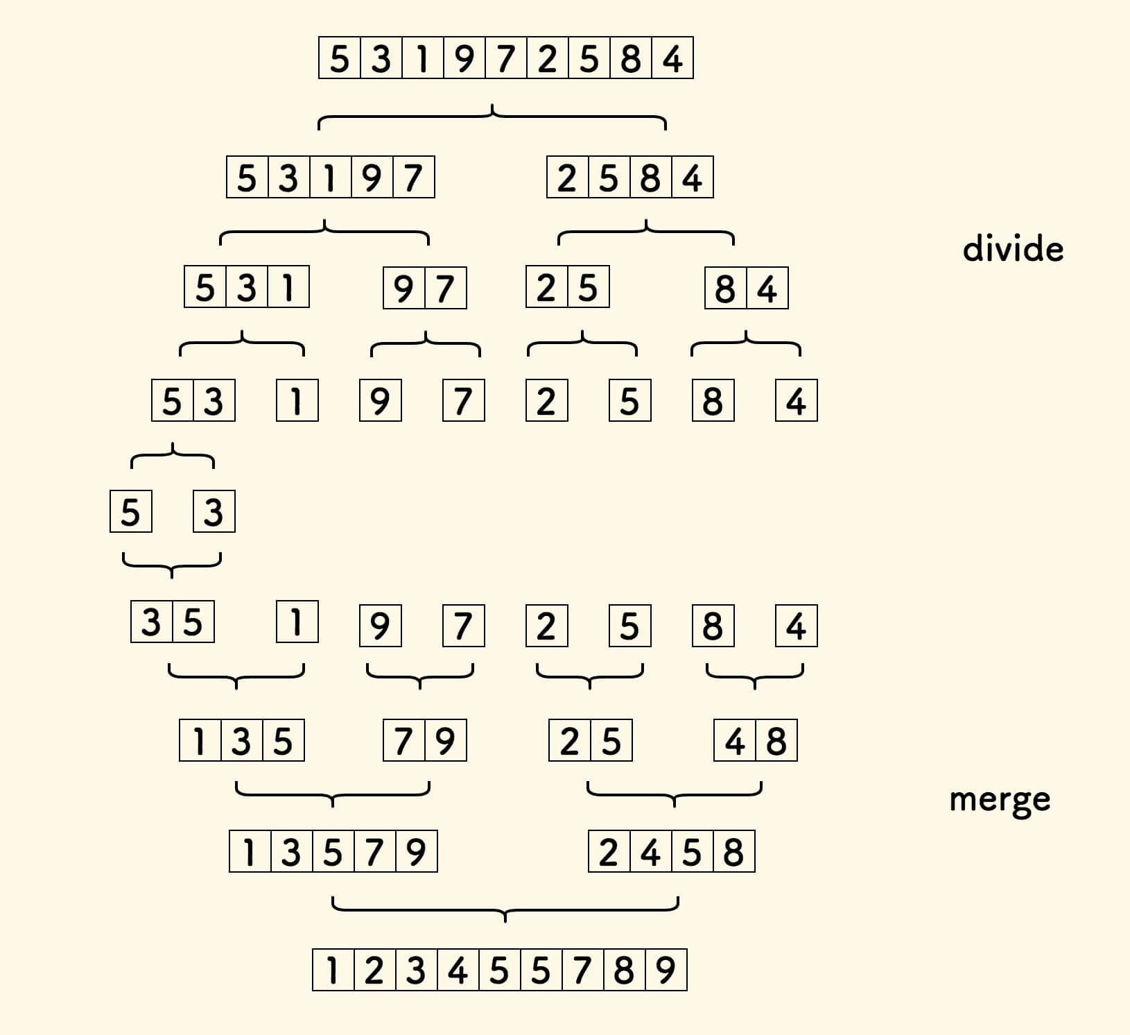 - 不断二分数组,直到每个子数组只有一个元素。