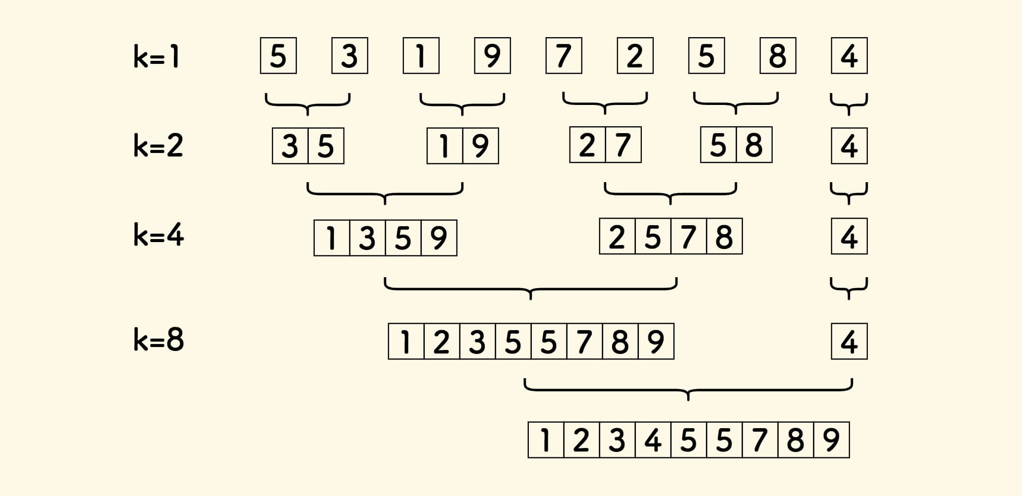 // k=2 每2个归并一次..