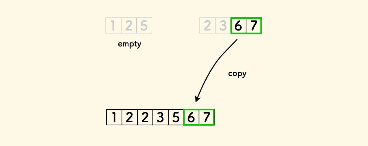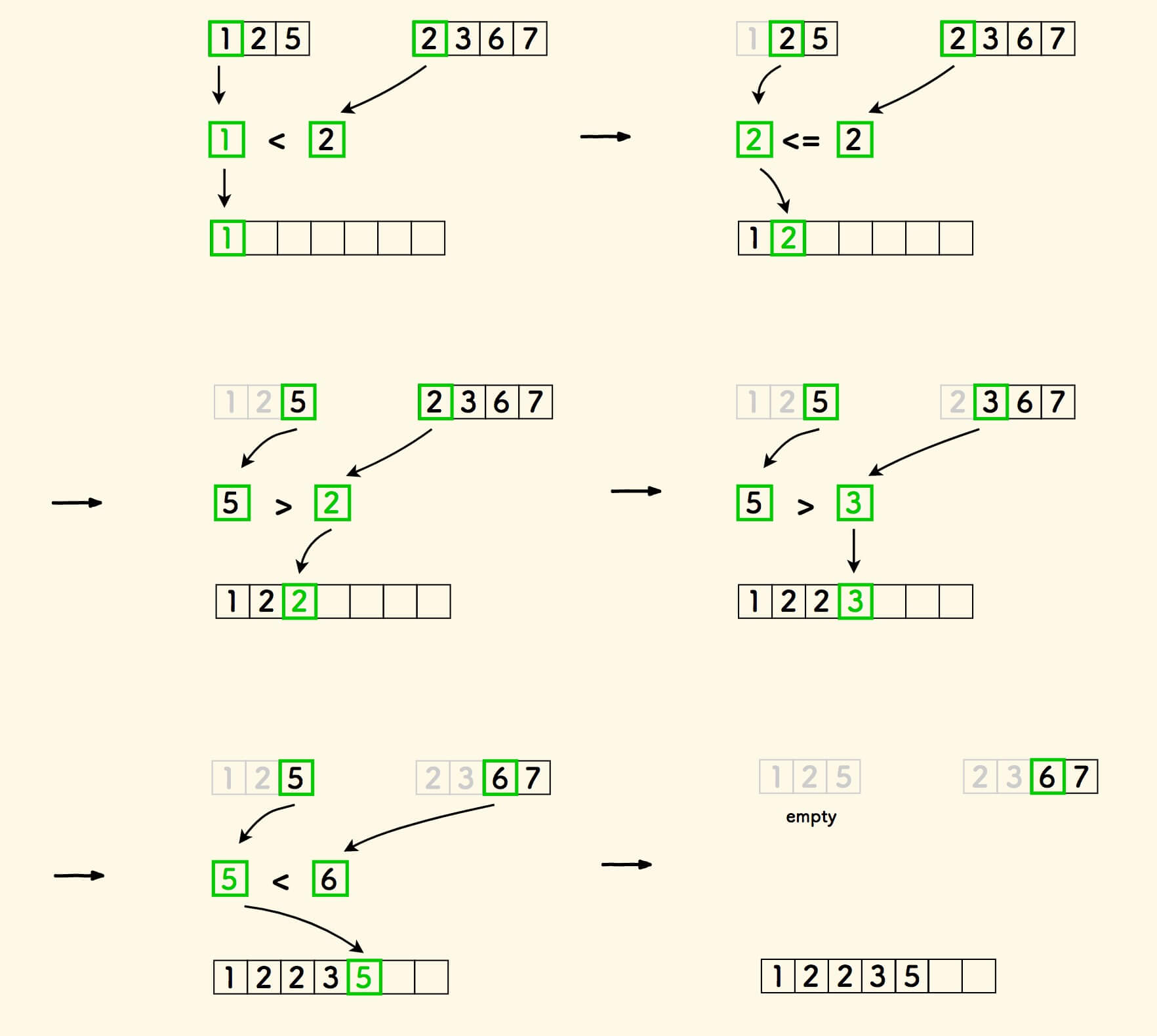 例如,合并 a=[1,2,5] 和 b=[2,3,6,7] 的结果是 [1,2,2,3,5,6,7] 。