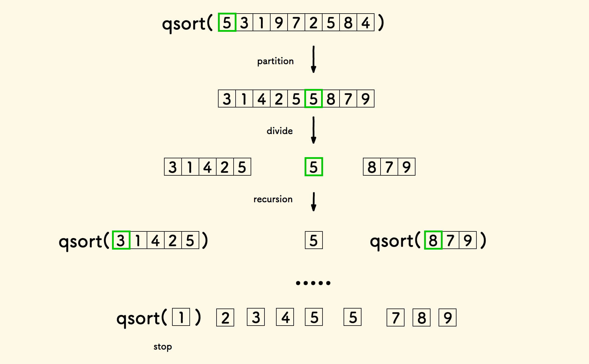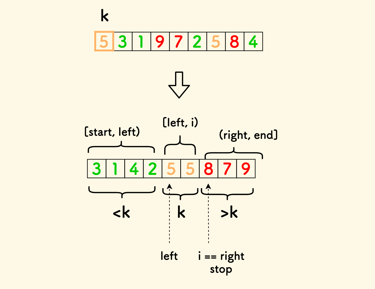 选一个元素当做基准值,把数组原地分割两份:
