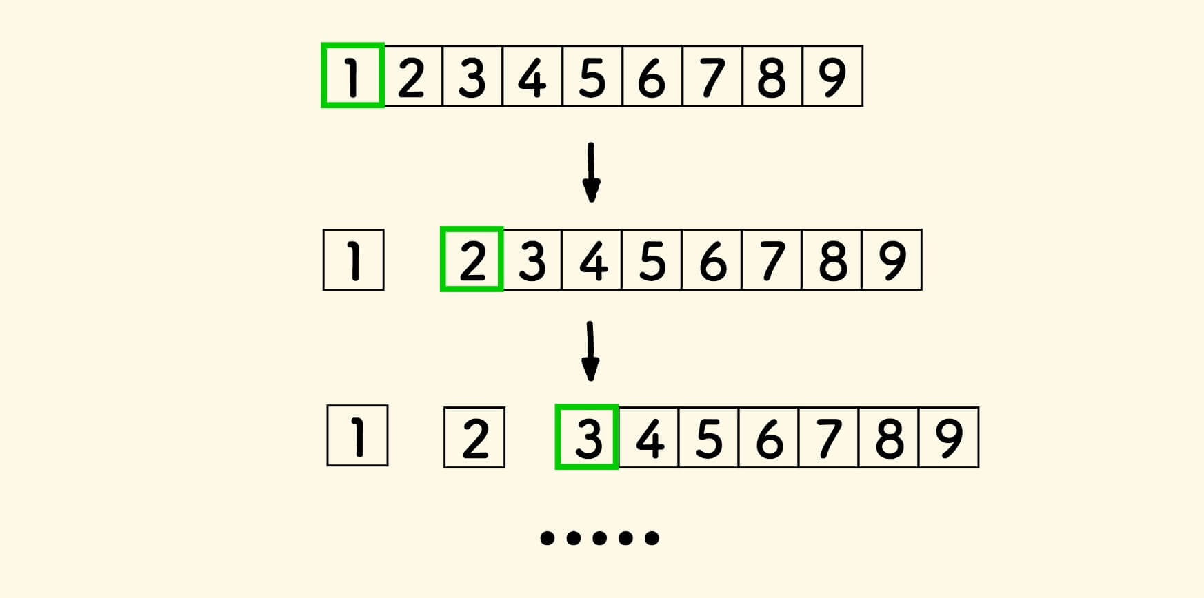 以数组 [5,3,1,9,7,2,5,8,4] 为例,选择第一个元素为基准元素。